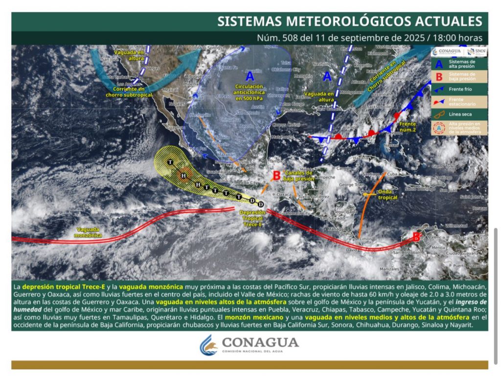 La circulación y desprendimientos nubosos de la Depresión Tropical Trece-E, en interacción con la vaguada monzónica y la inestabilidad atmosférica, provocarán lluvias intensas en los estados de Jalisco, Colima, Michoacán, Guerrero y Oaxaca, así como lluvias fuertes en el centro del país, incluido el Valle de México.