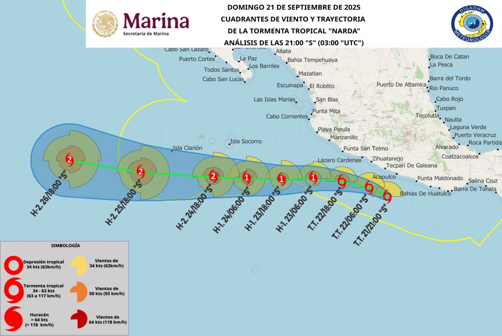 La tormenta tropical “narda”, mantiene su desplazamiento hacia el noroeste, frente a las costas de guerrero; sus bandas nubosas ocasionan cielo nublado a cerrado con chubascos, reducción de la visibilidad, tormentas eléctricas, rachas de viento fuerte y oleaje elevado sobre la costa de Chiapas, Oaxaca, Guerrero, Michoacán y área oceánica.
