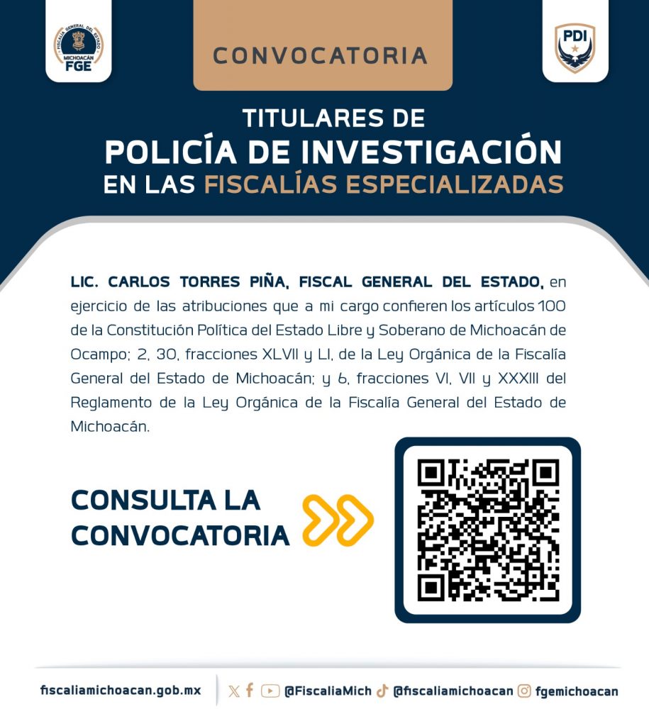 En un hecho sin precedentes, la Fiscalía General del Estado de Michoacán (FGE) emitió una convocatoria dirigida a todas las personas servidoras públicas de esta institución, interesadas en participar en el concurso para ocupar la titularidad de las Direcciones de Policía de Investigación de 15 Fiscalías Especializadas.