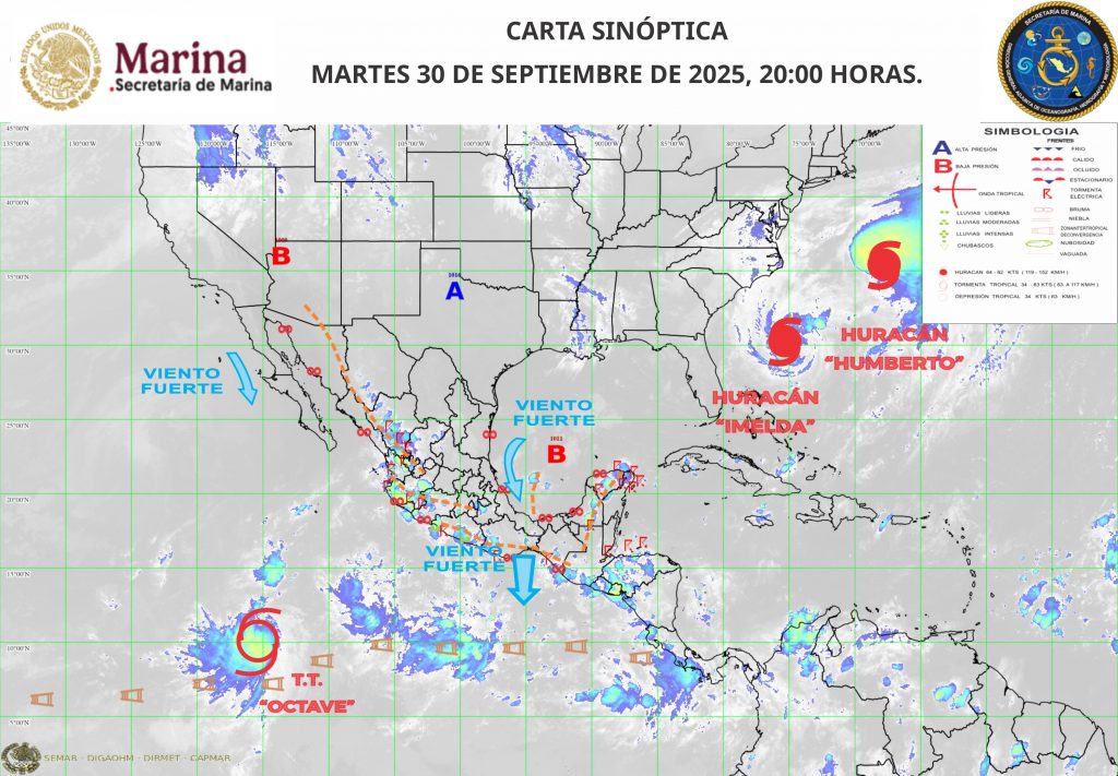 Zona de baja presión en la región pacifico sur, se localizó a las 18:00 horas a 455 km al sur de Puerto Escondido, Oax., y a 641 km al sur-sureste de Acapulco, Gro., con el 10% de probabilidad de desarrollo a ciclón tropical en las siguientes 48 horas y el 80% de probabilidad de desarrollo a ciclón tropical de 3 a 7 días. se mantiene en vigilancia.
