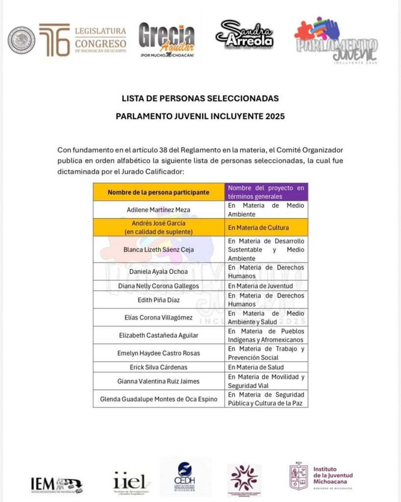 – Tras reconocer la participación de las y los jóvenes, la diputada Grecia Jennifer Aguilar Mercado, presidenta del Comité Organizador del Parlamento Juvenil Incluyente 2025, dio a conocer la lista de las y los seleccionados que formarán parte de este importante ejercicio de participación democrática, incluyente y transformadora.