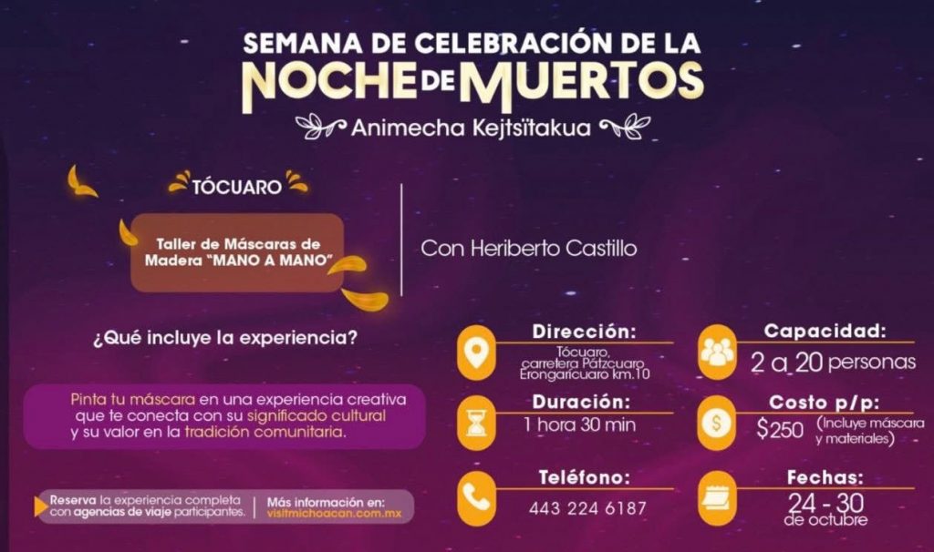El taller de elaboración de máscaras de Tócuaro es uno de ellos, y el cual permitirá al asistente convertirse en artista por un día, comentó la Secretaría de Turismo de Michoacán (Sectur), que encabeza Roberto Monroy García.