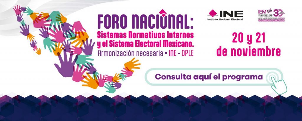 El Instituto Electoral de Michoacán (IEM) será sede del Foro Nacional “Sistemas Normativos Internos y el Sistema Electoral Mexicano. Armonización Necesaria INE–OPLE”, que se llevará a cabo los próximos 20 y 21 de noviembre en la ciudad de Morelia, Michoacán, con la asistencia de autoridades del Instituto Nacional Electoral (INE), del Tribunal Electoral del Poder Judicial de la Federación (TEPJF), de tribunales electorales locales y de los organismos públicos locales electorales (OPLEs) del país.