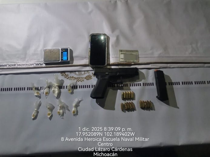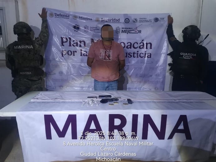 La Secretaría de Marina, a través de la Armada de México, por conducto de la Décima Sexta Zona Naval, en coadyuvancia con la Guardia Civil, como parte del Plan Michoacán por la Paz y la Justicia, informa que ayer se realizó la detención de un presunto transgresor de la ley, así como el aseguramiento de un arma corta, un cargador, cartuchos, ocho bolsas con sustancia blanca con características similares a las de la cocaína, además de un vehículo y equipo de comunicación, en esta ciudad y puerto.