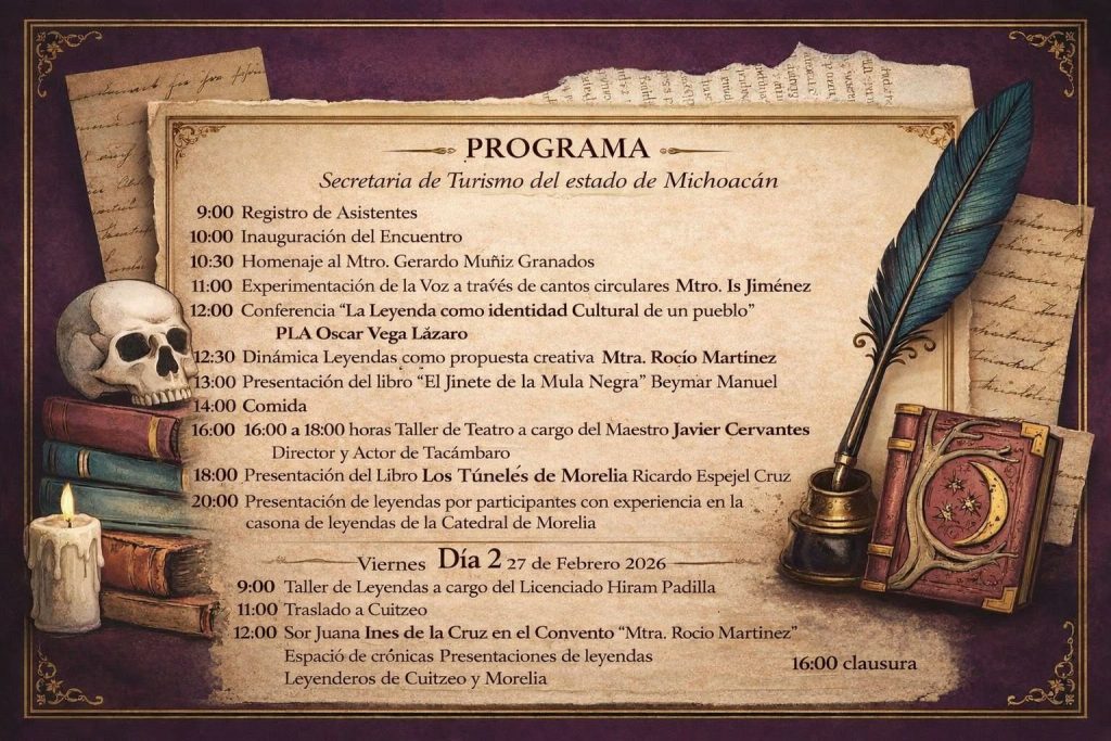 De la misma forma, la historiadora y actriz, Catalina Sanz Gallegos recordó que en Morelia existen relatos como “La Pila de la Mulata” o “La Mano en la Reja”, leyendas de túneles o “La Cueva del Toro”, narraciones que constituyen un acervo oral rico en simbolismos y significados locales.